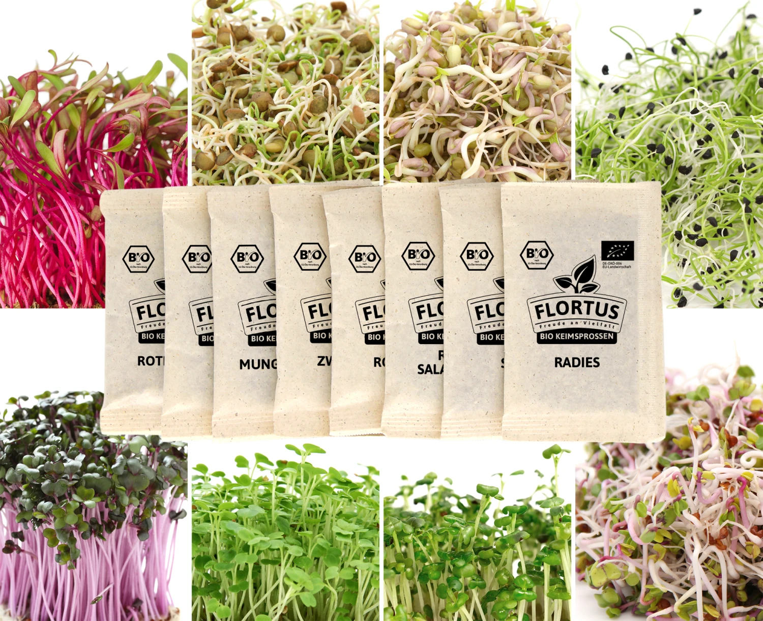 Nicht nur viele gesunde Inhaltsstoffe, sondern auch eine bunte Farbenpracht bringt das Sprossenset Regenbogen von FLORTUS mit. Sprossen waren noch nie schöner. Das macht die Keimsprossen ideal für Deko, aber auch für viele leckere Gerichte. In den Farben des Regenbogens kommen die Sprossen besonders gut zur Geltung. Das Regenbogen-Sprossenset ist ideal für Anfänger, da das Set 8 verschiedene Sorten enthält, mit denen sich Beginners ausprobieren können. Rote Rüben. Linsen, Zwiebeln, Senf und all die anderen Sorten sind auch geschmacklich sehr interessant und immer eine Aussaat wert.