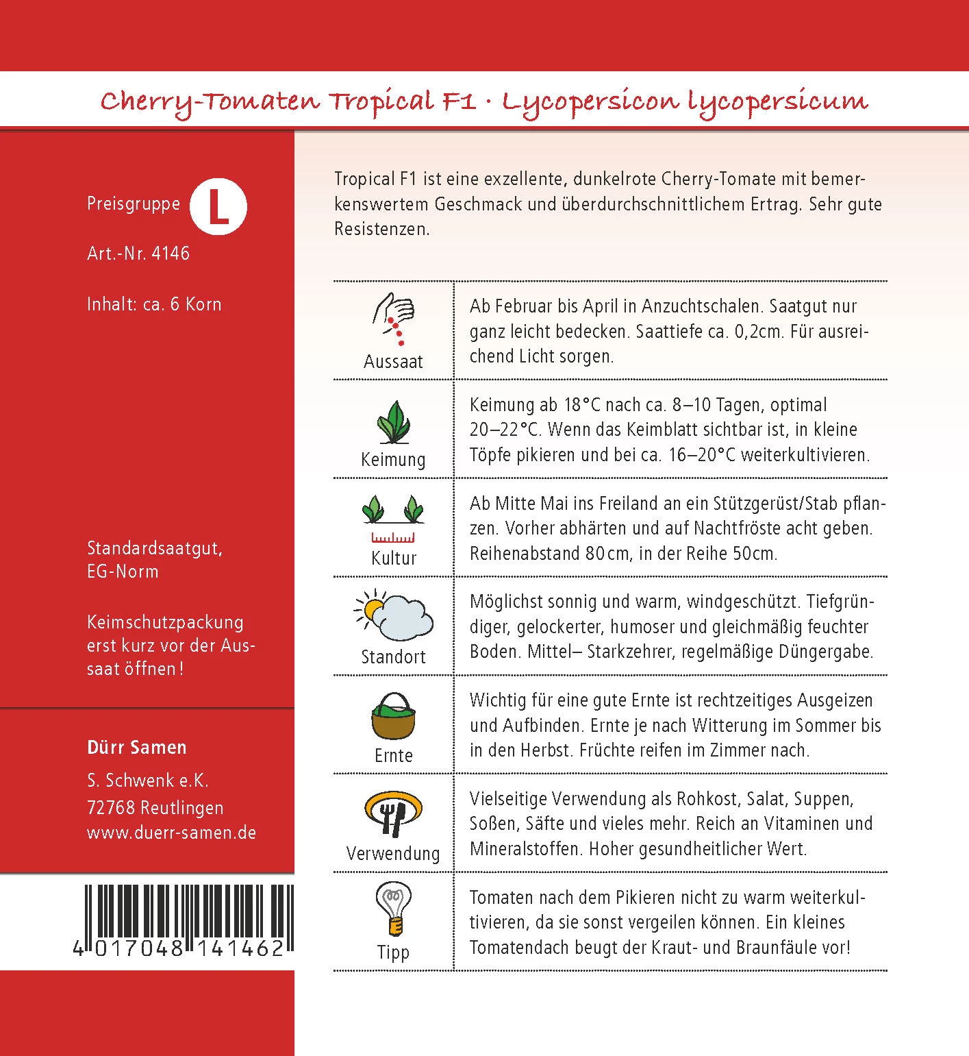 Tropical F1 ist eine exzellente, dunkelrote Cherry-Tomate mit bemerkenswertem Geschmack und überdurchschnittlichem Ertrag. Sehr gute Resistenzen.