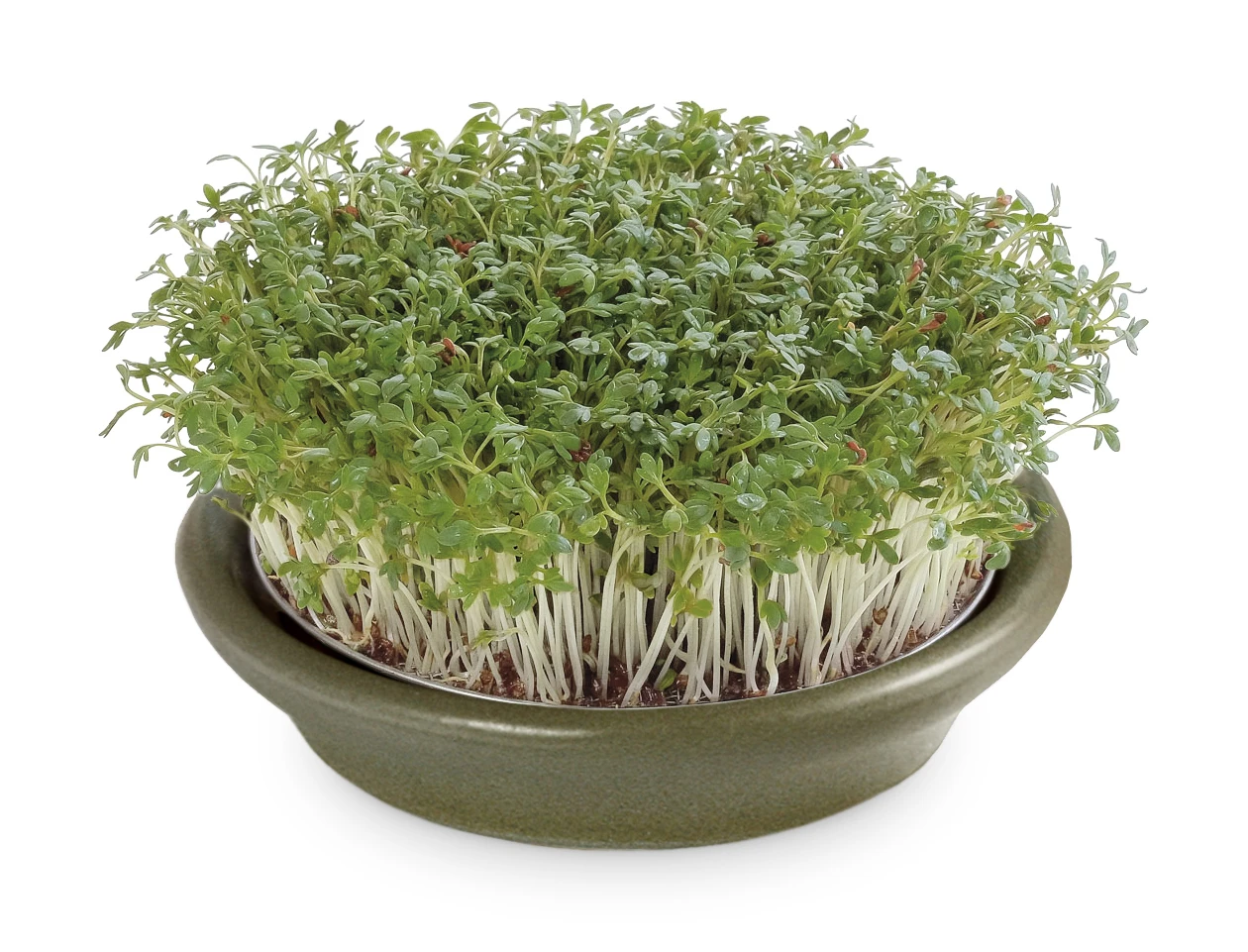 Hochgebrannte Keramikschale in Spitzenqualität. Deutsche Handarbeit aus Bayern. Über 1200 °C gebrannt und lebensmittelecht – durch Glasur optisch veredelt und sehr pflegeleicht. Auf einer Stufe am Innenrand der Keramikschale liegt das Edelstahlsieb immer waagerecht in einem definierten Abstand zum Schalenboden. Die Wurzeln haben den nötigen Platz, können sich gesund entwickeln und mit geerntet werden.