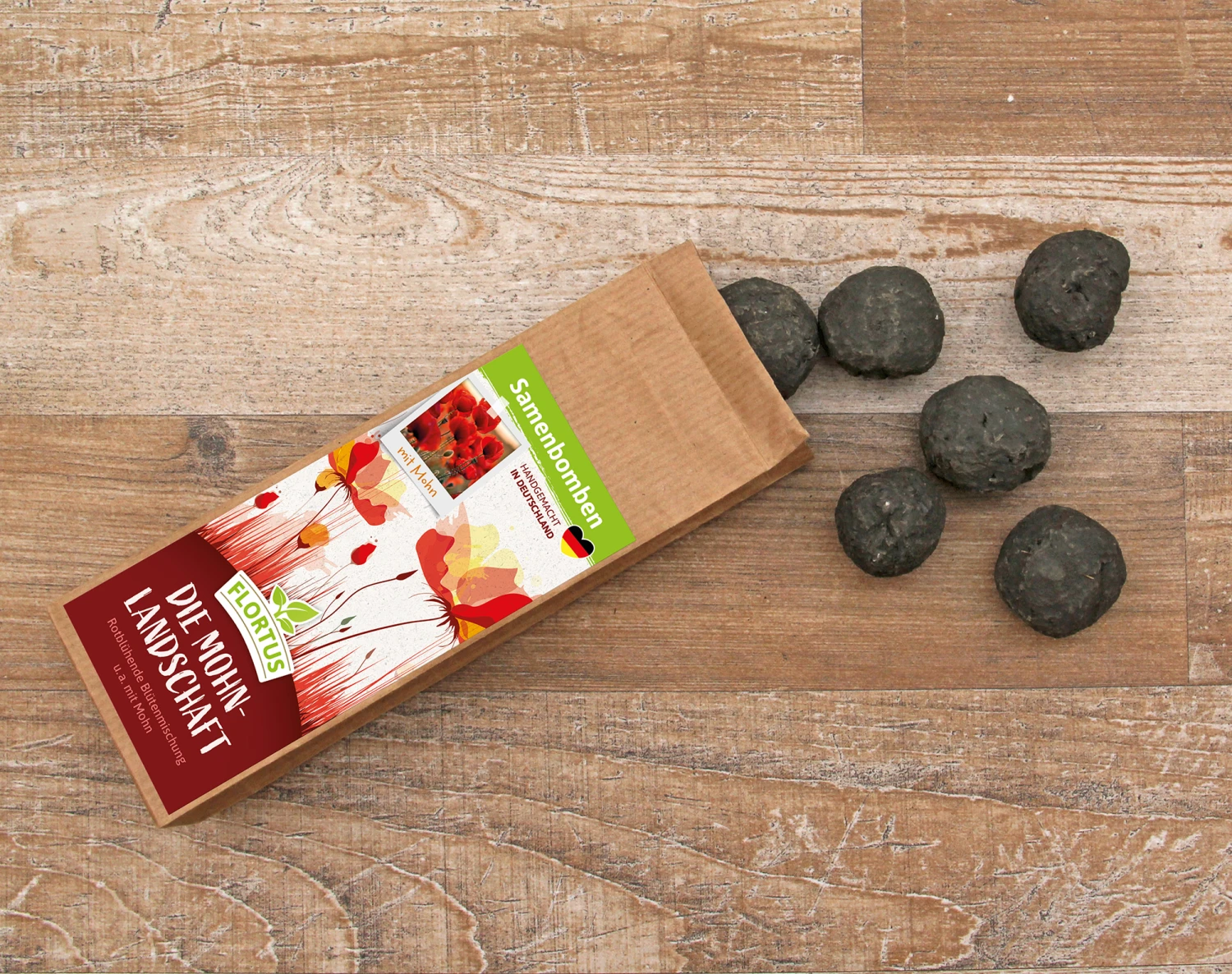 Wir möchten, dass die Pflanzenwelt in den Städten bunter wird. Das Einheitsgrün vielerorts bedeutet für Bienen, Hummeln und Schmetterlinge ökologisches Ödland. Dabei ist es leicht, eine reiche Artenvielfalt zu schaffen. Die FLORTUS Samenbomben können dazu beitragen! Für Garten oder Balkon, als Gastgeschenk oder Giveaway. Enthält viele verschiedene Mohnsorten, Kalifornischen Goldmohn und roten Lein.
