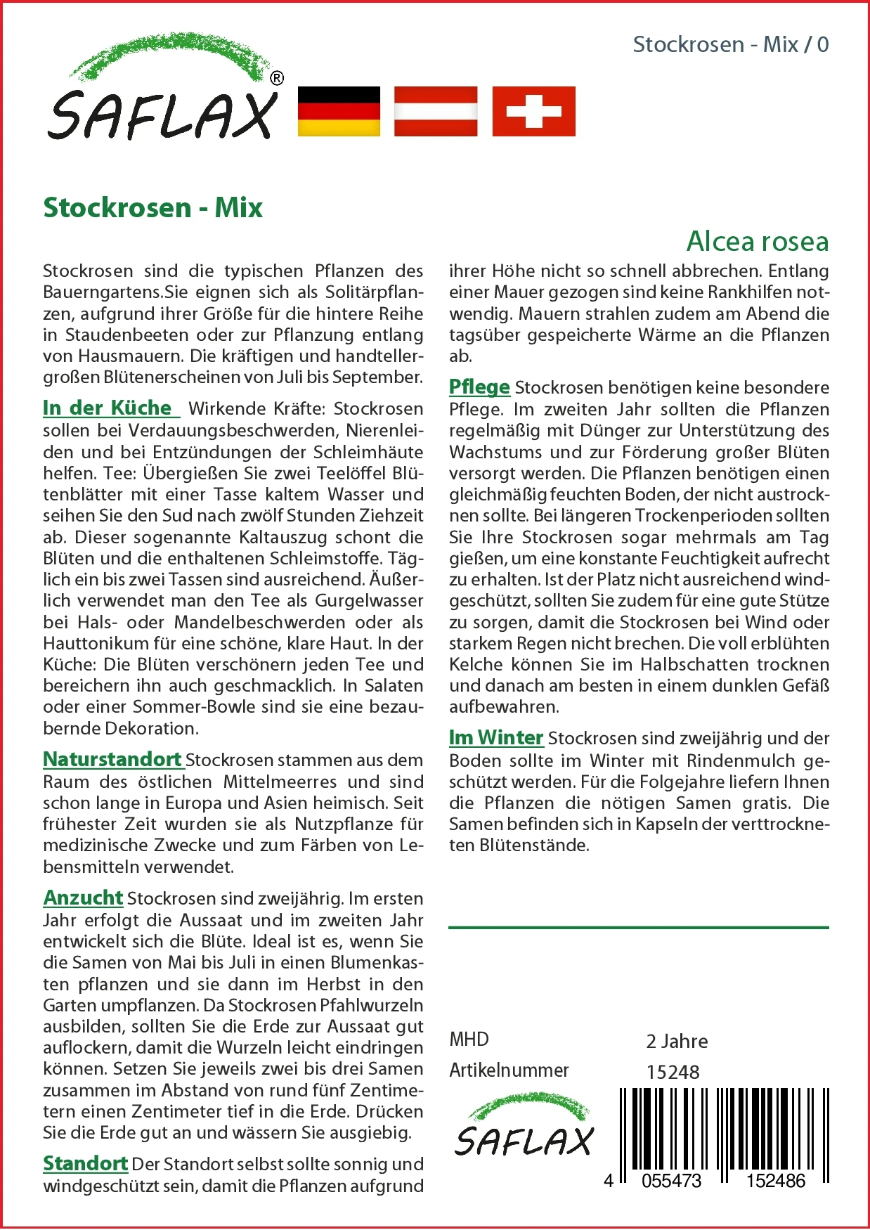 Stockrosen sind die typischen Pflanzen des Bauerngartens. Sie eignen sich als Solitärpflanzen, auf Grund ihrer Größe für die hintere Reihe in Staudenbeeten oder zur Pflanzung entlang von Hausmauern. Die kräftigen und handtellergroßen Blüten erscheinen von Juli bis September. Stockrosen sollen bei Verdauungsbeschwerden, Nierenleiden und bei Entzündungen der Schleimhäute helfen. Übergießen Sie 2 Teelöffel Blütenblätter mit einer Tasse kalten Wasser und seien sie den Sud nach 12 Stunden Ziehzeit ab. Dieser sogenannte Kaltauszug schont die Blüten und die enthaltenden Schleimstoffe. Täglich ein bis zwei Tassen sind ausreichend. Äußerlich verwendet man den Tee als Gurgelwasser bei Hals – oder Mandelbeschwerden oder als Hauttonikum für eine schöne klare Haut. Die Blüten verschönern jeden Tee und bereichern ihn auch geschmacklich. In Salaten oder einer Sommerbowle sind sie eine bezaubernde Dekoration. Stockrosen stammen aus dem Raum des östlichen Mittelmeeres und sind schon lange in Europa und Asien heimisch. Seit frühester Zeit wurden sie als Nutzpflanze für medizinische Zwecke und zum Färben von Lebensmitteln verwendet. Stockrosen sind zweijährig. Im ersten Jahr erfolgt die Aussaat und im zweiten Jahr entwickelt sich die Blüte. Ideal ist es, wenn sie die Samen von Mai bis Juli in einem Blumenkasten pflanzen und sie dann im Herbst in den Garten umpflanzen. Da Stockrosen Pfahlwurzeln ausbilden, sollten Sie die Erde zur Aussaat gut auflockern, damit die Wurzeln leicht eindringen können. Setzen Sie jeweils zwei bis drei Samen zusammen im Abstand von rund 5 cm, 1 cm tief in die Erde. Drücken Sie die Erde gut an und bewässern Sie ausgiebig. Der Standort selbst sollte sonnig und windgeschützt sein, damit die Pflanzen aufgrund ihrer Höhe nicht so schnell abbrechen. Entlang einer Mauer gezogen sind keine Ranken notwendig. Mauern strahlen zudem am Abend die tagsüber gespeicherter Wärme an die Pflanzen ab. Stockrosen benötigen keine besondere Pflege. Im zweiten Jahr sollten die Pflanzen regelmäßig mit Dünger zur Unterstützung des Wachstums und der Förderung großer Blüten versorgt werden. Die Pflanzen benötigen einen gleichmäßig, feuchten Boden, der nicht austrocknen sollte. Bei längerer Trockenheit des Periode sollten sie ihre Stockrosen sogar mehrmals am Tag Giesen, um eine konstante Feuchtigkeit aufrecht zu erhalten. Ist der Platz nicht ausreichend windgeschützt, sollten sie zudem für eine gute Stütze sorgen damit die Stockrosen bei Wind oder starkem Regen nicht brechen. Die voll erblühten Kelche können Sie im Halbschatten trocknen und danach am besten in einem dunklen Gefäß aufbewahren. Stockrosen sind zweijährig und der Boden sollte im Winter mit Rindenmulch geschützt werden. Für die Folgejahre liefern ihnen die Pflanzen die nötigen Samen gratis. Die Samen befinden sich in Kapseln der vertrockneten Blütenstände.