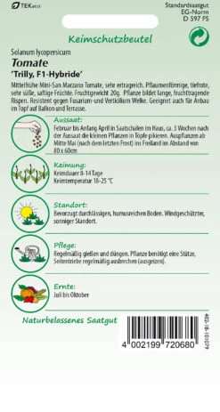 Mittelfrühe Mini – San – Marzano Tomate, sehr ertragreich. Pflaumenförmige, tiefrote, sehr süße, saftige Früchte. Fruchtgewicht 20 Gramm. Pflanze bildet lange, fruchttragende Rispen. Resistent gegen Fusarium – und Verticilium Welke. Geeignet auch für den Anbau im Topf und auf Balkon und Terrasse.